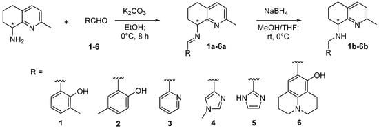 The synthesis of Schiff bases and the corresponding amines proceeded in racemic form as previously reported in the literature starting from salicylaldehyde [37] (Scheme 2). In order to avoid by-product formation as a consequence of the high reactivity of the primary amine of the 2-methyl-5,6,7,8-tetrahydroquinolin-8-amine scaffold, the preparation of the Schiff bases was carried out at 0 °C for 8 h, affording the desired products in good yields (65–70%), without further purification steps. The reduction of the imine group occurred at 0 °C as well but with lower yields (35–40%). The products were then purified by washing extensively the crude residue with tert-butyl-methyl ether.