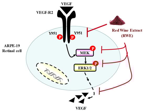 Cornebise, C.; Courtaut, F.; Taillandier-Coindard, M.; Valls-Fonayet, J.; Richard, T.; Monchaud, D.; Aires, V.; Delmas, D. Red Wine Extract Inhibits VEGF Secretion and Its Signaling Pathway in Retinal ARPE-19 Cells to Potentially Disrupt AMD. Molecules 2020, 25, 5564. https://doi.org/10.3390/molecules25235564
