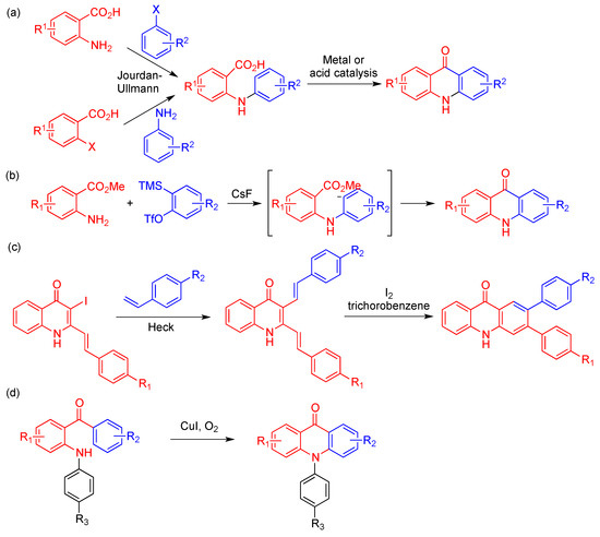 The most common synthetic access to 9-acridones involves the formation of the nitrogen ring from N-phenylanthranilic acid derivatives obtained via Jourdan–Ullmann couplings and heterocycle formation by the use of strong acids or catalyzed by metals [13,14,15] (Scheme 1a). An alternative approach reported by Larock and coworkers is based on the nucleophilic coupling of anthranilate with benzyne, which is formed in situ from a trimethylsilylphenyl triflate and cesium fluoride (Scheme 1b) [16]. Silva et al. described a new synthetic approach for the synthesis of 2,3-diarylacridin-9-ones, with a Heck coupling reaction between a substituted styryl and quinolone moiety as key synthetic step, followed of oxidative cyclization promoted by iodine (Scheme 1c) [17]. Deng research group described a synthetic alternative, in which the merged system is generated in the last reaction step, by oxidative cyclization of o-arylamino benzophenones (Scheme 1d) [18].