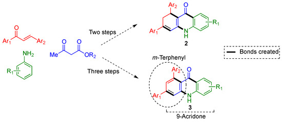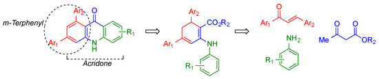 In spite of significant progress in the chemistry of this heterocyclic framework [19,20], some structural types of 9-acridones of potential interest in fields such as medicinal chemistry and materials chemistry have received little attention owing to limitations in the existing synthetic methodology. In particular, 1,3-diphenylacridin-9-ones are unknown in the literature despite the fact that they combine the acridone framework with an additional attractive structural fragment, namely m-terphenyl, which is important in materials science due to its high fluorescence [21] and also shows a variety of pharmacological activities [22,23,24,25]. In this article we describe our work towards addressing this synthetic challenge according to the strategy summarized in Scheme 2, which combines a multicomponent reaction with a 6π thermal electrocyclic reaction and a dehydrogenation step.