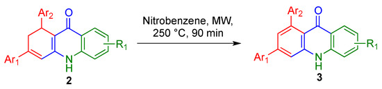 Finally, we investigated the aromatization of compounds 2 to the corresponding 1,3-diarylacridin-9-ones 3 (Scheme 5). The optimization of the reaction conditions was carried out on compound 2a as substrate and several dehydrogenating agents were tested. Palladium supported on carbon, manganese oxide in toluene at reflux conditions were tried without success. N-bromosuccinimide was also used tried as an aromatizing agent via halogenation-elimination [31] but these conditions also failed. DDQ in toluene (at room temperature, 120 min) and nitrobenzene (microwave, 250 °C, 90 min) were successful dehydrogenating reagents but the latter gave a higher yield and allowed a simpler purification process, as the reaction mixture could be purified by concentration in vacuo followed by trituration of the residue with diethyl ether to give the purified product by simple filtration. These conditions were applied to the whole compound library, with the results shown in Table 3.