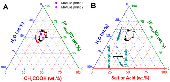 Table 1. Quantification of phase composition for the aqueous biphasic system composed of [P44414]Cl and CH3COOH at 313 K (TLL—Tie Line Length). The mixture point 1* has the same initial [P44414]Cl and CH3COOH concentration as mixture point 1 plus 2.00 wt.% NaCl.