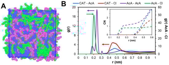 Figure 2. (A) Snapshot of the equilibrated [P44414]Cl + CH3COOH system with chloride anion and acetic acid in blue and C4 and C14 alkyl chains of [P44414]+ in purple and green respectively. (B) Radial distribution functions (RDFs) of the principal intermolecular interactions. The reference atom for [P44414]+ (CAT) was P whilst OH was taken for the carboxylic acid (AcA).