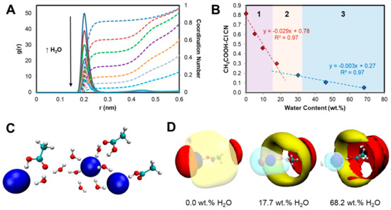 Figure 3. (A) RDFs of the CH3COOH···Cl with increasing water content (reference atoms for acetic acid were OH) and (B) corresponding coordination numbers (region 1 and 3 are monophasic whilst region 2 corresponds to the experimentally determined biphasic regime). (C) A representative snapshot of water-in-IL hydrated clusters for 5.1 wt.% H2O. (D) Spatial density function plots of the various system components around acetic acid for three water concentrations (Cl—blue; [P44414]+—yellow; CH3COOH—red; H2O—cyan).