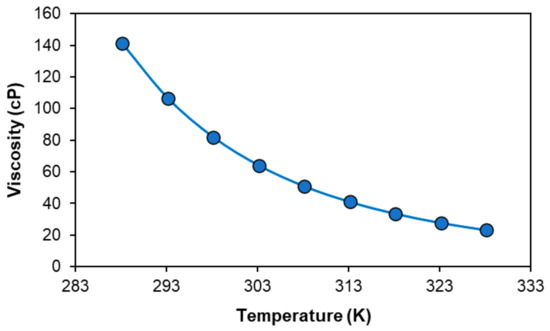 Figure 4. Viscosity of the 73.0 wt.% [P44414]Cl and 27.0 wt.% CH3COOH mixture as a function of temperature.