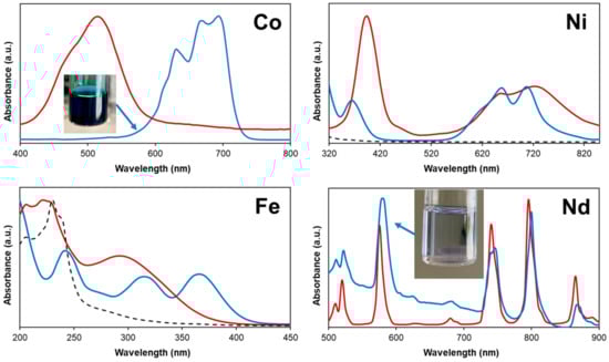 Figure 5. UV–vis spectra of the [P44414]Cl + CH3COOH system (73.0 wt.% [P44414]Cl and 27.0 wt.% CH3COOH) after metal oxide dissolution at 323 K for 24 h (blue line) and the corresponding spectra of the metal chloride salt in aqueous solution (red line). The dashed line corresponds to the spectra of the [P44414]Cl + CH3COOH mixture in the absence of metals.