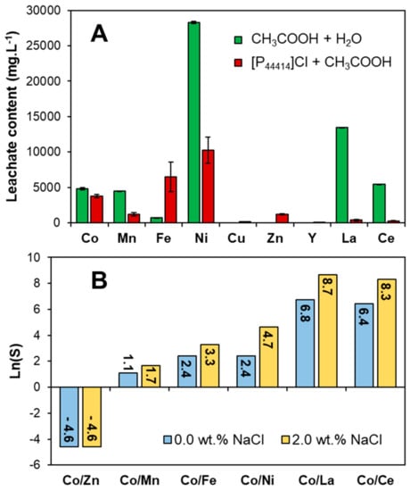Figure 6. (A) Metal concentration in the NiMH battery leachate composed of 27.0 wt.% CH3COOH aqueous solution and in the 73.0 wt.% [P44414]Cl + 27.0 wt.% CH3COOH mixture (t = 24 h, T = 323 K, S/L = 0.1). (B) Co(II) selectivity (S) in the biphasic [P44414]Cl + CH3COOH + H2O from the principal metals in the NiMH leachate. The total composition of systems 1 and 1* are provided in Table 1; individual metal distribution coefficients are available in Table S1.