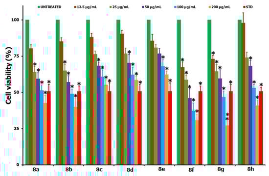 Comparison of cell viability results in vitro from the MTT assay against the HepG2 cells when treated with the tested compounds 8(a–h) with a range of concentrations (12.5–200 µg/mL; 24 h period). From the figure, Standard (STD) stands for melphalan (15 µg/mL); * and ** relate to the significant (p < 0.05) and highly significant (p < 0.01) values as compared against those obtained with the untreated measurements.