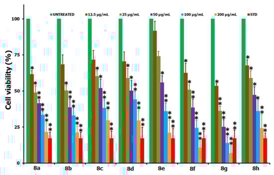 Cell viability comparison of MTT assay results of HepG2 cells from the treatment of compounds 8 (a–h) over a range of concentration (12.5–200 µg/mL; 48 h period). From the figure, STD stands for melphalan (15 µg/mL); * and ** relate to the significant (p < 0.05) and highly significant (p < 0.01) values as compared to those obtained with the untreated measurements.