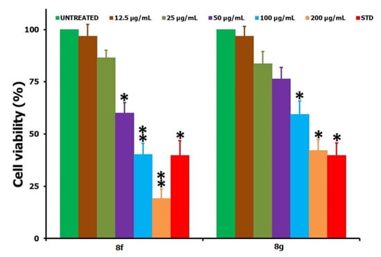 Comparison of MTT assay results of L929 noncancer cells following the incubation of two compounds 8f and 8g with a range of concentrations (12.5–200 µg/mL) over a 48 h period. STD stands for melphalan of 15 µg/mL; * and ** refer to the significant (p < 0.05) and highly significant (p < 0.01) values as compared to those obtained with the untreated controls.