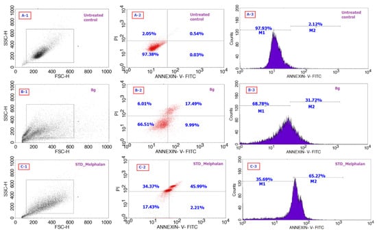 Figure 6 shows the flow cytometric analysis towards the measurement of ROS generated following the treatment of the compound 8g (at IC50 conc.) to the HepG2 cells when compared with those of the positive control (melphalan) and the negative control (cells of no treatment). From the analysis of results, it can be observed that about 97% of apoptotic cells generated the ROS in the case of the compound 8g treated cells (Figure 6 (B-3)) and this value was far higher than that of the positive control (melphalan)-treated cells (only 13.6% cells were apoptotic cells; Figure 6 (C-3)). The observation of such a high value of ROS generation from the compound 8g-treated cells indicated that most of the apoptotic cells released the ROS during their contact with the tested compound.