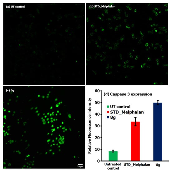 The involvement of caspases by means of caspase-3 activity was tested for the HepG2 cancer cells due to the treatment of the compound 8g (at IC50 conc.), where the results were compared against the untreated and melphalan-treated controls as shown in Figure 7. We observed a very high number of fluorescent cells from the tested compound 8g-treated cells (Figure 7c) as against those from the positive control (Figure 7b) and the negative control (Figure 7a), and the same trend was quantitatively shown in Figure 7d. This indicated that the HepG2 cells underwent the caspase-3 release before they lost the viability, thereby confirming for the involvement of caspases for the compound 8g-treated cells.