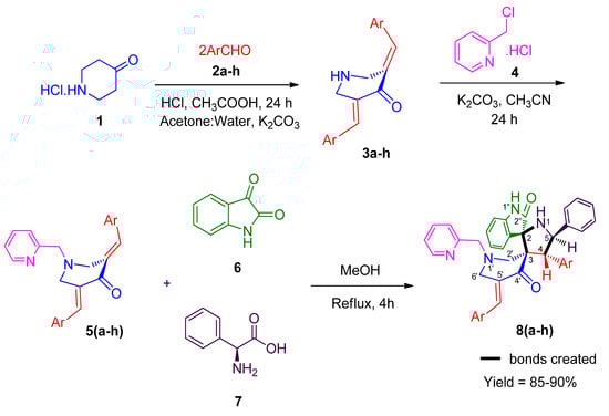 In our initial attempt, the synthesis of N-unsubstituted bisarylmethylidene-tetrahydropyridinones 3 (a–h) was performed according to the literature report as provided by Dimmock et al. [26]. With the compounds 3 (a–h) in hand, the dipolarophiles and N-substituted bisarylmethylidene-tetrahydropyridinones 5 (a–h) required for the present study were synthesized in a 85–90% yield range through the alkylation of 3 (a–h) with 2-(chloromethyl)pyridine hydrochloride in the presence of K2CO3 (Scheme 1) [27,28]. The azomethine ylide was generated in situ from isatin and phenylglycine via decarboxylative condensation. Our approach to the synthesis of spirooxindole molecular scaffold employing isatin 6 and (L)-Phenylglycine 7 was based on a multicomponent reaction strategy involving the 1,3-dipolar cycloaddition reaction between N-pyridinylmethyl-bisarylmethylidenepyridinones 5 (a–h) and azomethine ylide generated in situ from 6 and 7 as outlined in Scheme 1.
