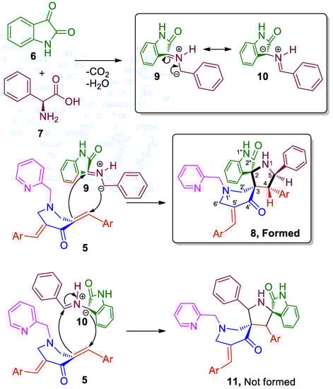 A probable mechanism accounting for the formation of molecular scaffolds 8(a–h) is shown in Scheme 2. Presumably, the reaction of isatin and (L)-Phenylglycine via decarboxylative condensation afforded the azomethine ylide which may exist in the resonating forms 9 and 10. Then, the regioselective addition of ylide 9 to one of the exocyclic C=C bonds of 5 (a–h), with the addition of nucleophilic carbon of the azomethine ylide to the more electron-deficient β-carbon of the dipolarophile to afford the cycloadducts 8 (a–h). The other possible regioisomer 11 formed by the addition of azomethine ylide 10 to the dipolarophile was not observed even in traces. The nonformation of this regioisomer may be attributed to the existence of steric hindrance experienced by the aryl and oxindole rings.