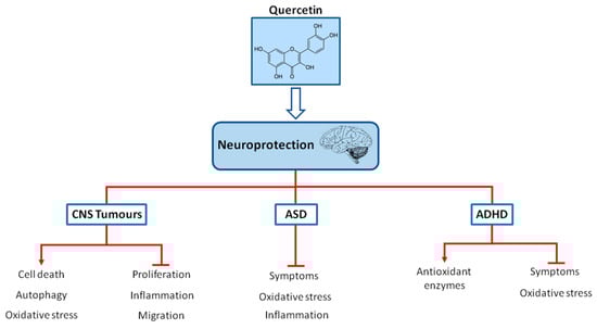 Chemical structure of quercetin and neuroprotection in pediatric neurological diseases (CNS tumors, ASD and ADHD). Quercetin may act as a neuroprotector in pediatric neurological diseases via the regulation of oxidative stress, inflammation, proliferation and improving symptoms and also via increasing antioxidant defenses, autophagy or cell death.