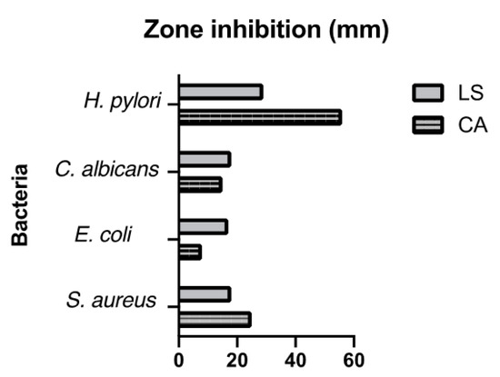 The antimicrobial activity of the CA_EO and LS_EO are shown in Table 3. The CA_EO was the most effective against S. aureus, E. coli, C. albicans and H. pylori with inhibition zones of 25, 8, and 15 mm (Figure 1), respectively and complete inhibition at the same concentration against H. pylori. The essential oil was shown to have antimicrobial activity against both Gram-positive and Gram-negative bacteria. Antimicrobial activity against E. coli was slightly less than that against S. aureus and C. albicans (p < 0.05) at the same concentration. The MICs of the CA_EO against the bacteria mentioned above were 19.0, 36.0, 31.0, and 30.0 μg/mL respectively, and LS_EO against the bacteria mentioned above were 64.0 μg/mL.
