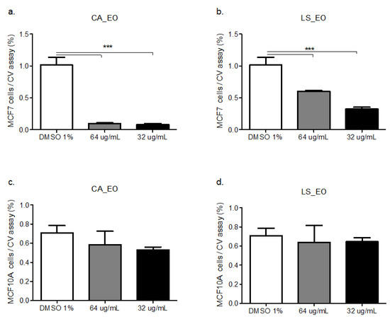 Dose-response curve of the human epithelial mammary tumor cell line MCF-7 (a,b) and epithelial mammary non-tumoral cell line MCF10A(c,d) treated with CA or LS EOs. The graph bar corresponds to the proliferation of MCF-7 treated with the EOs at different concentrations versus control (DMSO 1%) for 48 h, evaluated by CV assay at 570 nm. Three independent trials were performed, in triplicate, for each treatment and concentration. *** p < 0.001.