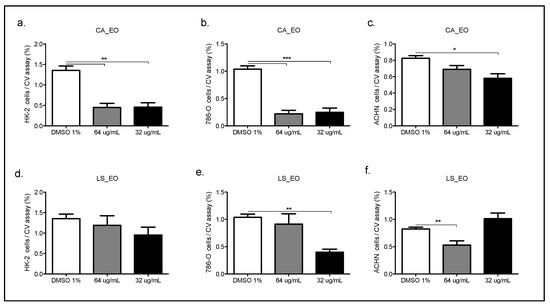 Dose-response curve of the human epithelial renal non-tumor cell line (HK2, a–d) and tumor cells line ((786-O, b–e) and (ACHN, c–f)), treated with CA or LS EOs. The graph bar corresponds to the proliferation of Hk2, 786-O and ACHN, treated with the EOs at different concentrations versus control (DMSO 1%) for 48 h, evaluated by CV assay at 570 nm. Three independent trials were performed, in triplicate, for each treatment and concentration. * p < 0.05, ** p < 0.005, *** p < 0.001.