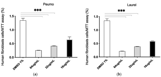 Dose-response curve of human fibroblasts cells treated with Cryptocarya alba (Peumo; CA); Laurelia sempervirens (Laurel; LS) EOs. The graph bar corresponds to the proliferation of fibroblasts cells treated with the Eos (a. Peumo) and (b. Laurel), at different concentrations versus control (DMSO 1%) for 48 h, evaluated by MTT assay at 570 nm. Three independent trials were performed, in triplicate, for each treatment and concentration. *** p < 0.001.