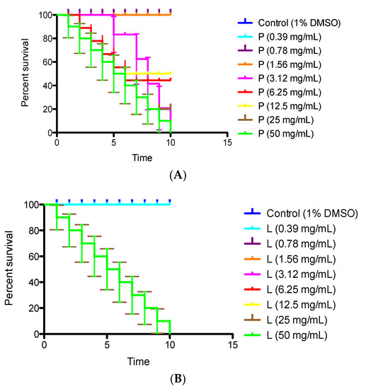 (A) Percent survival of P (Peumo, C. alba) and (B) L (Laurel, L. sempervirens) EOs against C. elegans.