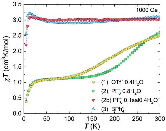 Examination of the intermolecular arrangements in complexes (1)–(3) revealed that only the two complexes that exhibited thermal SCO, complexes (1) and (2), make strong intermolecular contacts (See Supplementary Materials Figures S1–S4). These were by way of hydrogen bonding, which in the case of triflate complex (1) connected the complex cation to the counterion via the guest water molecule at both 100 K and 293 K (Figures S1 and S2). In the case of the hexafluorophosphate complex, a hydrogen bond was confirmed between the complex cation and partial occupancy water molecule at both measured temperatures (Figures S3 and S4), but the nature of the interaction with the counterion was less clear, especially given the significant distortion of the PF6− counterion in the 100 K structure. In marked contrast both high spin complexes (2b) and (3) had no intermolecular interactions with the complex cation and this likely contributed to the locking-in of the spin quintet state over the thermal range. In complex (2b) the partial occupancy guest water and 4-methoxysalicylaldehyde molecules were highly disordered but were distinct from the [MnL1]+ cation and PF6− counterion, the latter two forming neither hydrogen bonds nor π–π interactions, Figure S5. Thus the [MnL1]+ spin carrier was isolated in this lattice with the large guest molecule, Figure S6, and persisted in a fixed spin state while the temperature was reduced. A similar fixed spin-state response was observed in complex (3) with the largest counterion, BPh4−, which was not disposed to form hydrogen bonds, and which also therefore tended to isolate the complex cation, thereby preventing SCO [].
