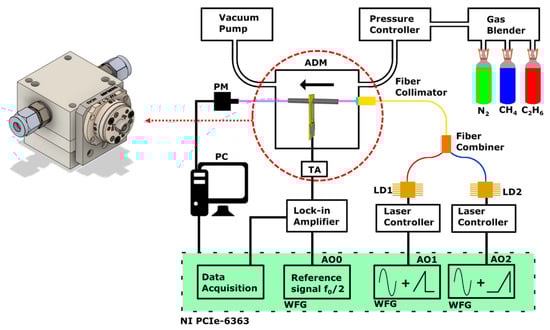 Schematic of the experimental apparatus: ADM—acoustic detection module, LD1—laser diode 1, LD2—laser diode 2, TA—transimpedance amplifier, PM—power meter, PC—personal computer, WFG—waveform generator. The black arrow indicates the gas flow through the ADM. A detailed design of the fiber-coupled ADM is also shown.