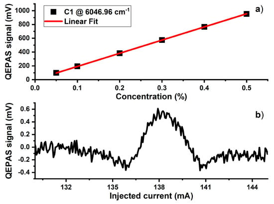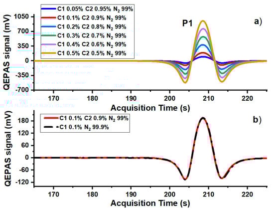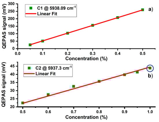 Figure 4b shows the comparison between the P1 QEPAS spectra measured for a mixture of 0.1% of C1 in a matrix of pure N2, and a mixture with a C1 concentration fixed at 0.1%, while C2 concentration is at 0.9% and the rest is N2. It is clearly visible that the presence of 0.9% of C2 does not influence the intensity or the shape of P1, neither in terms of absorption interference nor in terms of energy relaxation as a collisional promoter. This experimental evidence is confirmed by the perfect linearity of the peak value of P1 versus the C1 concentration (Figure 5a) extracted from the 2f-QEPAS spectra shown in Figure 4a.