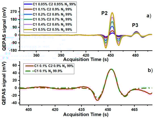 P2 and P3 features are well-resolved in the 2f-QEPAS scans even for unbalanced mixtures (e.g., 0.05% C1—0.95% C2—99% N2). Additionally, in W2 the C1 exhibits no absorption background, but the C2 broadband absorption slightly influences the P2 peak profile. Indeed, as shown in Figure 6b, a small difference between the spectra related to the 0.1% C1—99.9% N2 (green dash dots) and 0.1% C1—0.9% C2—99% N2 (red line) mixtures can be appreciated just for the negative lobes. This means that the C1 concentration measurements extracted from the peak values are not affected even in a mixture with a C2 concentration almost one order of magnitude larger than C1, which is still an unlikely situation in real life.