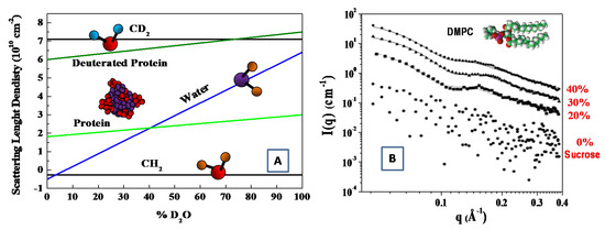 As deuterium has a much larger coherent neutron scattering length than hydrogen (see Table 1). Deuterium (2H)-isotope labeling and contrast variation have been employed in SANS for probing the structural information of biological molecules [33,36]. More specifically, by changing relative ratio of D2O/H2O, the scattering length density can vary, to a wide extent, to match the scattering length density of different materials. In this case, the structural information of the individual components (within a multi-component biological complexes) can be best probed through selective deuterium labeling, when the scattering of the other unlabeled components is rather weak. Such an approach has been employed to investigate complex interaction in bio-systems, such as multi-protein complexes, protein–carbohydrate complexes, protein–lipid complexes [36,37]. The structural information of the individual components of biomolecules can be probed by means of the contrast variation (or scattering length density matching) through the variation of the D2O ratio in solution (see Figure 3) [38].
