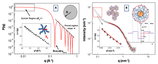 Plot of the form factor P(q) of a sphere with R = 30 Å. An example of a SAXS Guinier fitting of P(q) of a star polymers nanopartarticle (with a radius of gyration Rg = 17.2 Å) in water solution is presented in the inset (A). Fit of the form factor P(q) SAXS intensity for the polydimethylsiloxane-b-polyethyleneoxide (PDMS-b-PEO)/water. System (at ca oncentration of 0.05 g/cm3) with the core-shell model (B). Scattering-length density (SLD) distribution of the core-shell micelles is reported in the inset (adapted from Lombardo et al. [61]).