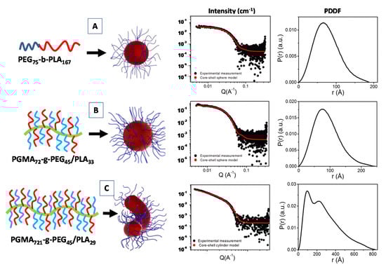 Structural characterization of the SAXS form factor P(q) and pair distance distribution function (PDDF) analysis for the poly(ethylene glycol)-b-poly(lactic acid) (PEG75-b-PLA167) diblock copolymers system (A), and the poly(ethylene glycol)-b-poly(lactic acid)-b-poly(ethylene glycol) PGMA72-g-PEG45/PLA33 (B) and PGMA721-g-PEG45/PLA29 (C) graft copolymer systems. Adapted with permission from [71], Copyright 2019 American Chemical Society.