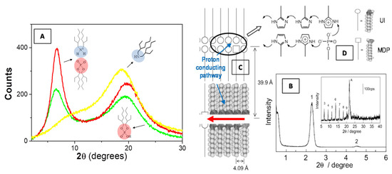 Scattering profile of a bis(2-ethylhexyl)amine/bis(2-ethylhexyl)phosphoric acid binary liquid mixture (equimolar mixture, red line) as compared to the two neat components bis(2-ethylhexyl)amine (yellow line) and bis(2-ethylhexyl)phosphoric acid (green line) (A). It can be noted that the mixture shows an increase of the intensity at the low-angle peak as a consequence of the local intermolecular self-assembly (A). X-ray diffraction pattern (peak 1) at low angle (B) and associated higher-order diffraction peaks at high angle (inset of B) regions of the 2-undecylimidzole (UI)−monododecyl phosphate (MDP) composite materials, evidence the formation of highly ordered bilayer lamellar structures [85]. The formation of a proton-conduction mechanism (C) is favorite by the imidazole headgroups (D) that are protonated by the proton transfer from neighboring MDP molecules. Adapted with permission from [85], Copyright 2019 American Chemical Society.