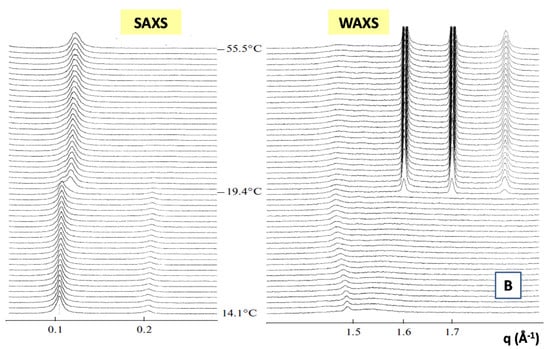 In Figure 7, we report the time evolution of the SAXS and WAXS spectra during the cooling of multilamellar DPPC vesicles in excess water (from temperature T = 14 °C to T = −55.5 °C) [99].