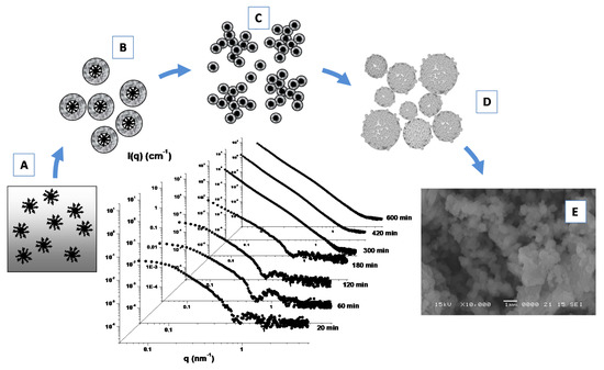 Furthermore, the formation of porous Linde type A (LTA) zeolite nanostructures from a clear sol containing amphiphilic PDMS-b-PEO block copolymers micelles (Figure 8A) as templating agents has been investigated by means of SAXS experiments (Figure 8) [107]. During the early stage of the growth process the formation of core-shell primary units (of 4.8 nm) with a core-shell morphology (Figure 8B) was driven by the zeolite aluminosilicate components incorporation onto the micellar surface. A successive (and progressive) aggregation process among these primary units leads to the formation of extended secondary units (Figure 8C), which undergo a further cross-linking, fusion and rearrangement, thus, leading to the formation of final submicrometer aggregates (Figure 8D), as confirmed by SEM experiments (Figure 8E). Those studies furnish important insights for the understanding of the self-assembly processes involved in the design and development of hybrid organic–inorganic mesoporous materials, as well as stimulating the study of alternative methods for the production of novel materials with new characteristics and properties.