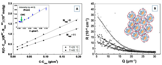 In Figure 4B, we report the SAXS profile for the aqueous solution of amphiphilic polydimethylsiloxane-b-polyethyleneoxide (PDMS-b-PEO) diblock copolymer. Assuming that block copolymer micellar aggregates are composed of a PDMS core and the PEO chains in a surrounding shell, the corresponding form factor P(q) can be described by a core-shell model expressed as a function of core and shell radius, R1 and R2, respectively, and the core, shell and water scattering-length, ρc, ρs, ρ0, respectively [61].