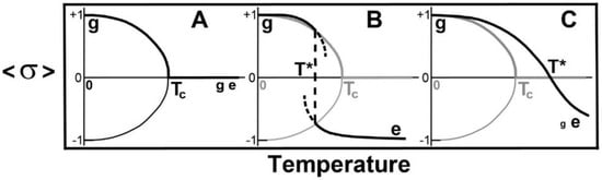 If the term in is omitted and we employ statistical mechanics to obtain thermodynamic quantities, then, using analytical techniques or computer simulation, we obtain the solutions to the average value of , , for the two- and higher-dimensional Ising model [33,34,35], and which is independent of j. The temperature-dependence is shown schematically in Figure 2A, with a continuous phase transition at temperature . For the one-dimensional Ising model, , for . However, if we retain then there are two limits: as , which favours the spin-up state, g, while as , which favours the spin-down state, e. Accordingly, there exists a temperature, T*, at which changes sign so that we obtain a “spin reorientation” transition, that is, a transition , when , where:
