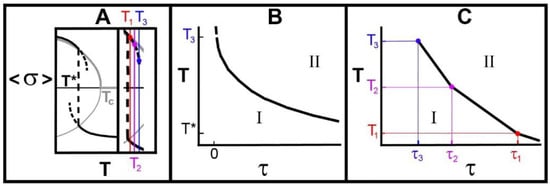 We reiterate that we have modelled a system exhibiting a single discontinuous transition. We now relate the metastable regime associated with the discontinuous phase transition (Figure 2B) of the g-e model, the binodal (coexistence curve), to the relaxation time-temperature diagram obtained from a consideration of isothermal relaxation. Figure 4A shows a schematic cartoon of the discontinuous transition together with an expanded view of the metastable regime, the binodal (dashed curves), and three equally-spaced temperatures, . The first is very close to the transition temperature, , while the third is very close to the end of the metastable regime. We assume that the lifetime of the superheated metastable state at temperature, , follows a modified Vogel-Fulcher-Tammann (VFT) equation [45,46,47,48,49]: