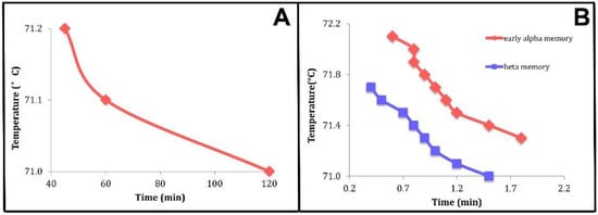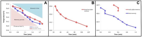 Two things can be seen in Figure 5 and Figure 6: (i) the relationships have the general appearance of the curves shown in Figure 4B,C and (ii) although the temperatures shown concerning “α memory” are greater than the phase transition temperatures of the α phase of these systems, the temperatures shown that involve “β memory” are less than those listed for the β phase transition temperatures of MMM [50], PPP [51], and SSS [52].