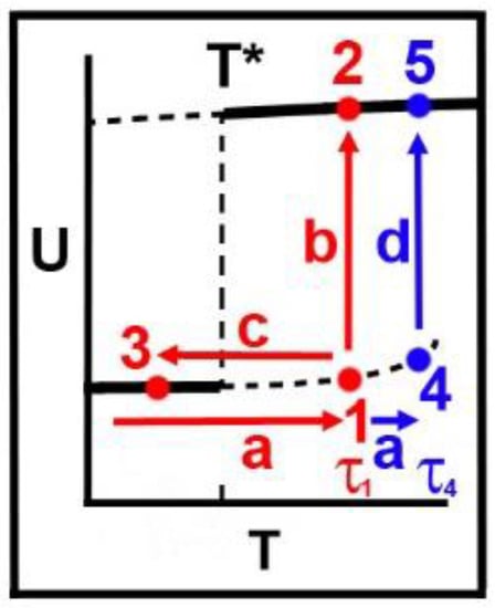 We can now relate the metastable regimes of the model to understand our proposal for the physical basis of the crystal memory effect shown in Figure 4, and this is shown in Figure 7. There, a portion of the enthalpy versus temperature curve (Figure 3B), including the discontinuous transition at , is shown. Also shown are two temperature ramps (a) to states 1 and 4 and two relaxations (b,d) to equilibrium states 2 and 5. Alternatively, the system can be cooled (c) from 1 to 3 thereby exhibiting a memory effect. A similar procedure (not shown) would involve cooling from state 4. The times and represent the average lifetimes that one can hold the system in the metastable regimes 1 and 4 before they relax to the equilibrium states 2 and 5, respectively.