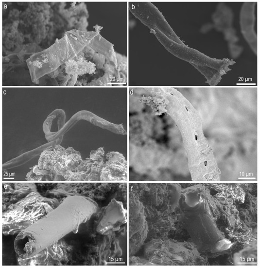 SEM images of the residue obtained after shock processing of 18 amino acids (Table S1). Several features, including (a) a thin ribbon, (b) a typical helical structure, (c) a branching filamentous thread and (d–f) a hollow tubule, were observed.