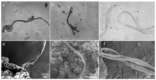 Photomicrographs of filamentous structures observed of size range ~ 20 µm in (a) Mighei meteorite, (b) Murray meteorite, (c) Dimmit meteorite [45] and (d–f) similar structures observed in SEM micrographs of shock processed residue of amino acid.