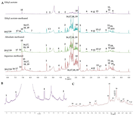The sample preparation and NMR measurements were executed according to established protocol [40] with some modifications. For each sample, a 20 mg weight of the extract was placed into an Eppendorf tube, and mixed with an equal volume (300 µL) of deuterated methanol and prepared buffer (pH 6.0 and 0.01% TSP). Prior to analysis, the mixture was homogenized by an ultrasonication technique (15 min, 25 °C) and subsequently centrifuged for 15 min at a speed of 4000 rpm. For 1H-NMR spectral acquisition, 550 µL of filtered extract solution was pipetted into a clean NMR tube.