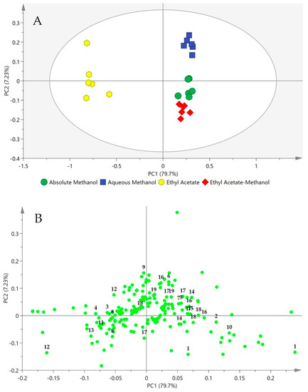 Principal component analysis (PCA) score (A) and loading (B) plots constructed from 1H-NMR spectral data of four different solvent extracts of OPL. The plot ellipse represents 95% hoteling T2 confidence. Identified metabolites: 1, sucrose; 2, fructose; 3, α-glucose; 4, β-glucose; 5, choline; 6, citric acid; 7, fumaric acid; 8, palmitic acid; 9, succinic acid; 10, aconitic acid; 11, fatty acid; 12, α-linolenic acid; 13, acetic acid; 14, (−)-epicatechin; 15, (+)-catechin; 16, orientin; 17, isoorientin; 18, vitexin; 19, isovitexin.