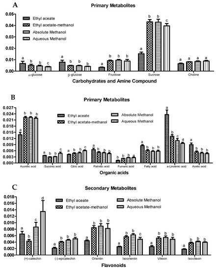 Relative quantification of identified compounds in different solvent extracts of OPL based on the mean peak areas of selected 1H-NMR signals. (A) Carbohydrates and amines; (B) organic acids; (C) flavonoids. The discriminating chemical shifts (ppm) employed for the relative quantification were sucrose (δ 3.82), fructose (δ 4.18), α-glucose (δ 5.18), β-glucose (δ 4.62), choline (δ 3.20), citric acid (δ 2.74), succinic acid (δ 2.54), aconitic acid (δ 3.42), α-linolenic acid (δ 1.30), acetic acid (δ 2.07), palmitic acid (δ 0.9), fatty acid (δ 1.34), (+)-catechin (δ 7.02), (−)-epicatechin (δ 6.94), orientin (δ 7.54), isoorientin (δ 7.40), vitexin (δ 8.02), and isovitexin (δ 7.79). Bars labelled with the different letters (a,b,c,d) are significantly different between solvent extracts for the same metabolites (p < 0.05).