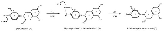 Schematic diagram of hydrogen transfer mechanism in (+)-catechin. (A): (+)-Catechin; (B): Hydrogen bond stabilized radical; (C): Stabilized quinone structure.