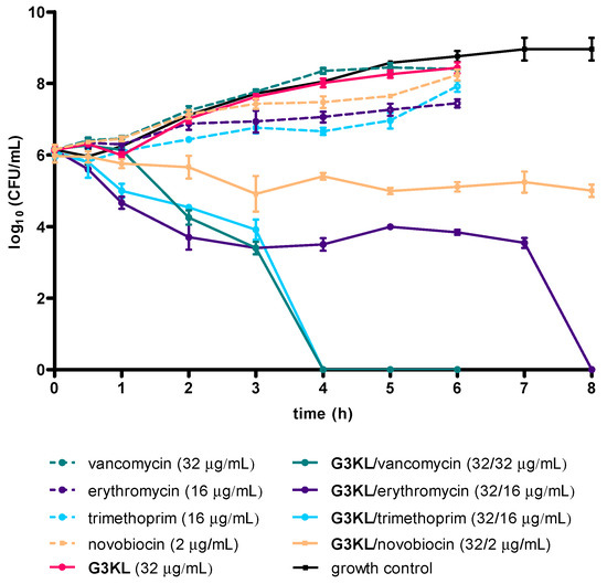 Time-kill kinetics against K. pneumoniae (NCTC418) were performed on G3KL (32 µg/mL), vancomycin (32 μg/mL), erythromycin (16 μg/mL), novobiocin (2 μg/mL), G3KL/vancomycin (32/32 μg/mL), G3KL/trimethoprim (32/16 μg/mL), and G3KL/erythromycin (32/16 μg/mL) and using 2× the concentrations indicated by the checkerboard assay. Untreated bacteria at 1 × 106 CFU/mL were used as a growth control.