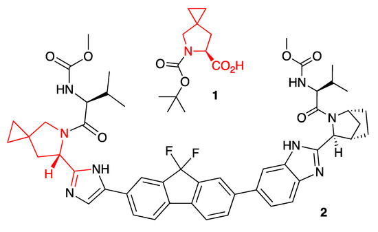Non-natural amino acids are often used as building blocks of active pharmaceutical compounds [1,2,3,4]. In particular, proline analogues are especially attractive since their presence in peptide chains causes conformational restrictions which are critical for biological activity [3]. Among modified prolines, the Boc-protected amino acid 5-azaspiro[2.4]heptane-6-carboxylic acid (1, Figure 1) has recently become a key element in the synthesis of ledipasvir (2) [5], a potent non-structural protein 5A (NS5A) inhibitor that is used for treatment of hepatitis C virus infections (HCV) [6,7,8].