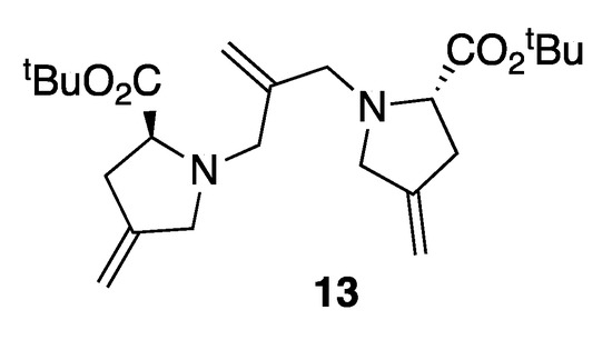 Encouraged by this promising result, the same sequence was performed, but without isolating alkylated intermediate imine 11. Furthermore, CDCl3 was substituted by non-deuterated chloroform in the cyclization. As a result, the product was obtained in a better yield but the excess of alkylating agent 10 promoted a further alkylation of the desired product 12 and dimeric proline 13 (Figure 2) could be obtained (up to 10% yield) when 5 equivalents of 10 was used.
