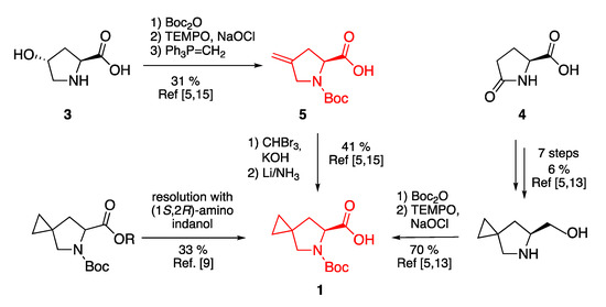 - From 4-hydroxyproline: Tymtsunik, A.V.; Bilenko, V.A.; Ivon, Y.M.; Grygorenko, O.O.; Komarov, I.V. Synthesis of a novel Boc-protected cyclopropane-modified proline analogue. Tetrahedron Lett. 2012, 53, 3847–3849. [Google Scholar] [CrossRef]