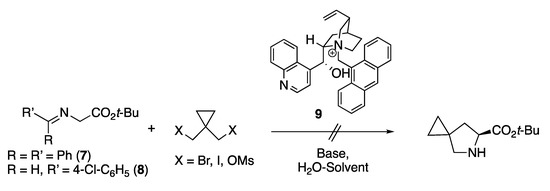 We envisaged that the direct enantioselective alkylation of glycine-derived imines with 1,1′-bis(halomethyl)cyclopropanes under PTC conditions would give ready access to the 4-spiro cyclopropane proline backbone. Unfortunately, the neopentylic nature of the alkylating reagent prevented any alkylation reaction. Thus, 1,1′-bis(bromomethyl)cyclopropane, 1,1′-bis(iodomethyl)cyclopropane (and also 1,1′-bis(mesityloxy methyl)cyclopropane) did not react with neither tert-butyl N-diphenylmethyleneglycinate (7) nor p-chlorophenylmethylene imine 8 in the presence of a commercially available chinchonidine-derived [26,27] catalyst 9 (Scheme 2) using different bases (KOH or CsOH) and solvents (toluene or CH2Cl2) under phase-transfer conditions [26].